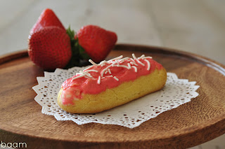 Strawberry glaze: in a small bowl combine all the ingredients adding more milk if necessary, carefully dip eclairs with this glaze and let it harden.